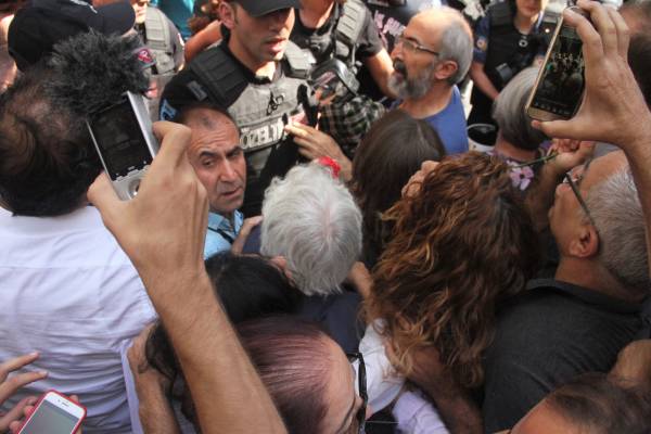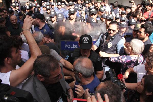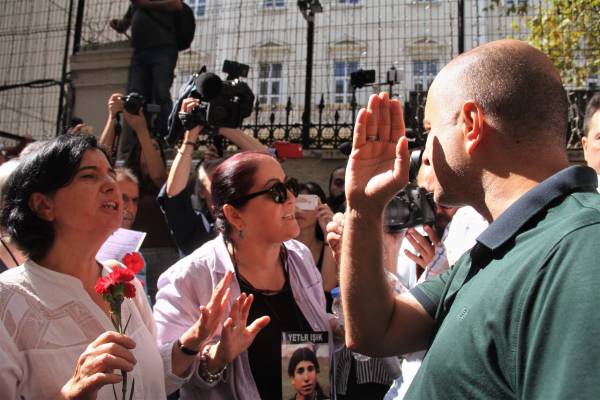 The police surrounded the crowd, battering and kettling them back into the IHD building. The attack was protested by chants of, “Human dignity will prevail against torture,” and Besna Tosun, daughter of Fehmi Tosun who disappeared in custody, protested the police and said: “We are being deprived of our constitutional right to hold a press statement. Give us our graves, let justice reign and we will stop coming here.”