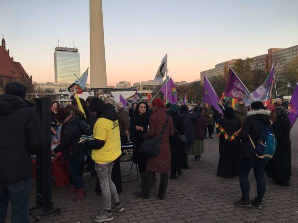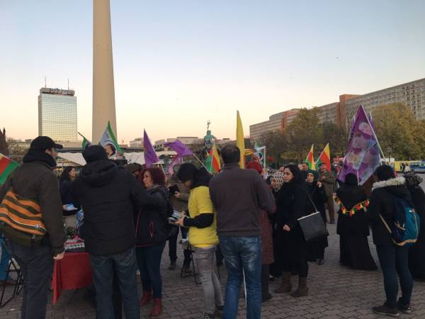 The Öcalan Library/Passengers of Truth were greeted by an enthusiastic crowd of Kurdistan people at the Alexanderplatz Square where demonstrators opened a stand of Öcalan’s books and spoke about the goal of their action.