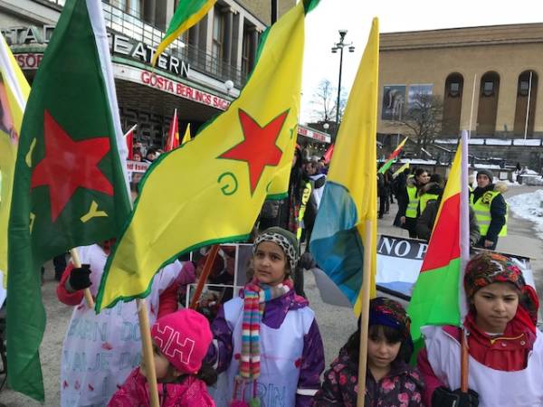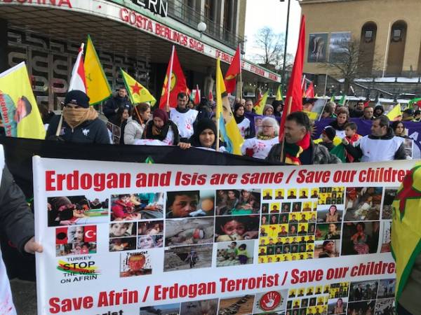 In Malmö despite a ban, a demonstration took place in the station with banners reading "Condemn the occupation by Russia and Turkey" and "Long live the resistance of Afrin". In Gothenburg, hundreds moved through the city center. The protest march was led by women and children in red-painted shirts to point out the women and children murdered in Afrin. Posters said: "Erdoğan and the ISIS are the same, terrorist Erdoğan." Also in Helsingborg a demonstration with about 100 participants took place.