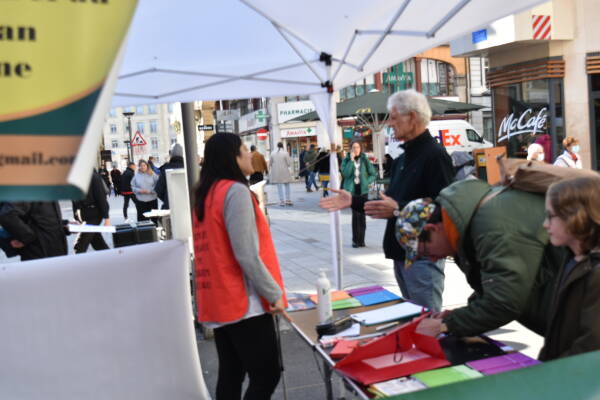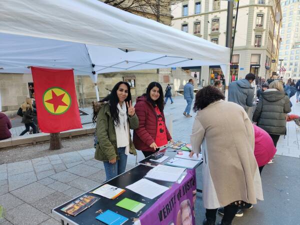 In Lausanne, activists from the Kurdish youth organisations Jinên Ciwan ên Tekoşer (TekoJIN) and Tevgera Ciwanên Şoreşger (TCŞ) provide information about the Kurdish movement and Abdullah Öcalan's ideas regarding a grassroots democratic, gender-free and ecological social order at a stand in the city centre every Wednesday as part of their campaign "Werin Cenga Azadiyê" (Come to the freedom struggle). Today, the action was supported by members of the Lajîn Women's Council, who at the same time distributed leaflets with information about the campaign to remove the PKK from the terror list and collected signatures for the petition."