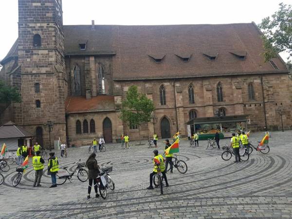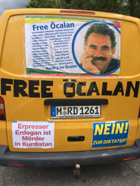 Before the activists started to cycle, a minute of silence was held and short speeches were made on behalf of Nuremberg Democratic Kurdish Society Center (NAV-DEM) and German supporters. The speeches gave the message: "We condemn the isolation on Kurdish people's leader Abdullah Öcalan, and want that the doors of the Imrali prison get opened."