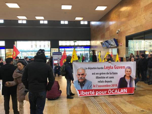 An action was organized in Geneva, Switzerland to support Leyla Guven who is on hunger strike for 91 days in protest of Ocalan’s isolation. The action was organized by activist from the Revolutionary Youth Movement at the central train station where hundreds of informative leaflets were distributed to raise awareness about the Kurdish hunger strikers.