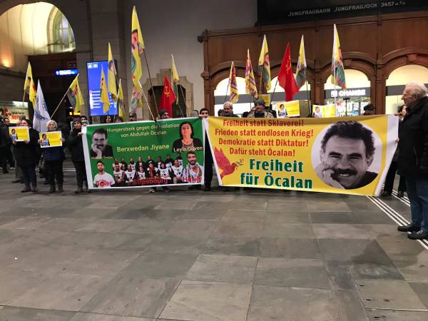 Kurds and their friends gathered at the central train station to join the demo promoted by CDK-Basel and opened a banner reading “Hunger strikes to counter isolation against Öcalan”.