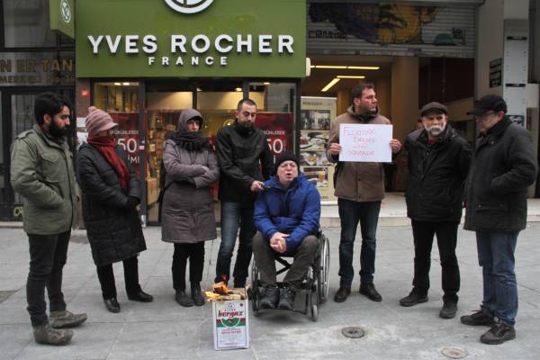 Workers were prevented by the Gezbe district governor from lighting a fire to keep warm in front of the Yves Roche store, despite the low temperature. HDP deputy Musa Piroğlu call on the people of Kadikoy to support Flormar workers and boycott Yves Rocher brand products.