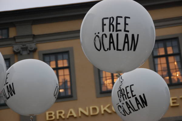 Another protest was held in front of the Swedish Parliament for Öcalan’s freedom. The protest held on the call of the Stockholm Democratic Kurdish Society Center and the Amara Kurdish Women’s Association includes a tent set up on the square in front of the Parliament. A cage was also placed in the square to protest the isolation, and white balloons with the words “Free Öcalan” on them were tied to the cage. The protesters placed candles in the front and placed signs demanding Öcalan’s freedom.