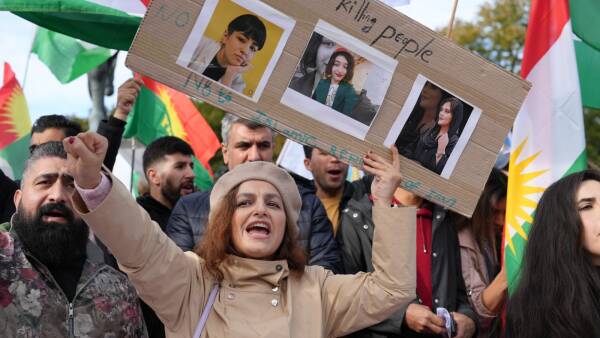 Protesters displayed posters of Jina Mahsa Amini, a 22-year-old Kurdish woman whose death in the custody of morality police in Tehran sparked protests in mid-September, which have been increasingly ongoing since. The slogans chanted during the demonstration included “Jin, Jiyan, Azadi” [Woman, Life, Freedom], which has become a symbol of the women-led uprising in Iran and Eastern Kurdistan.