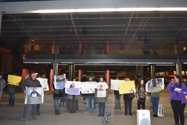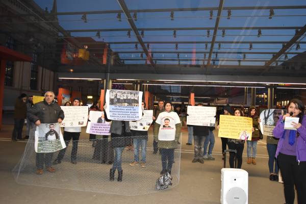 During the performance, activists had their hands tied with iron wires symbolizing prisons and held the photos of Leyla Güven, Nasir Yagiz, prisoners on hunger strike, the hunger strikers in Strasbourg.