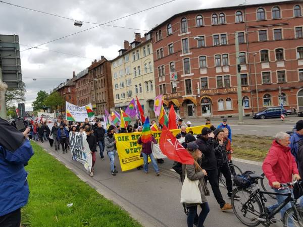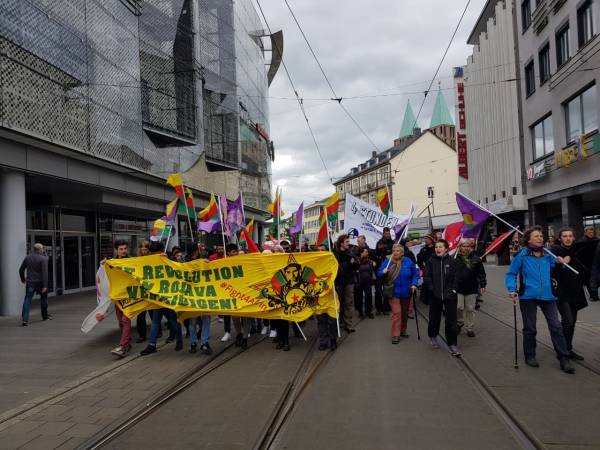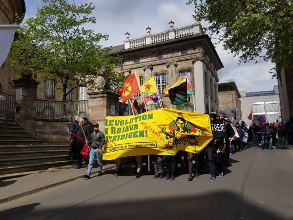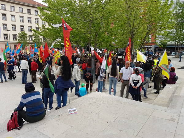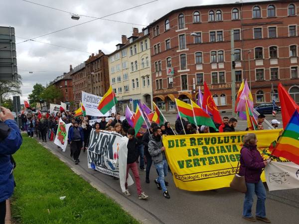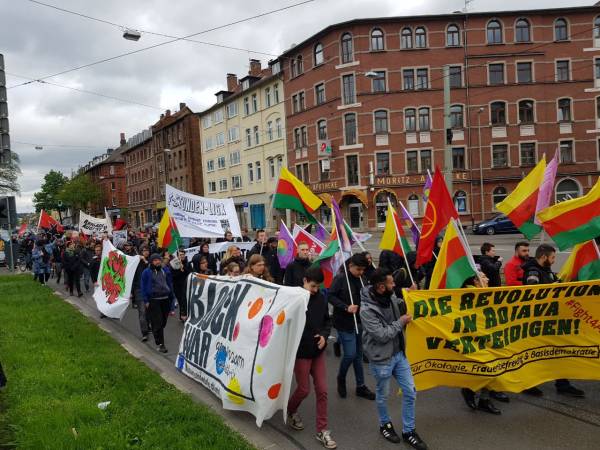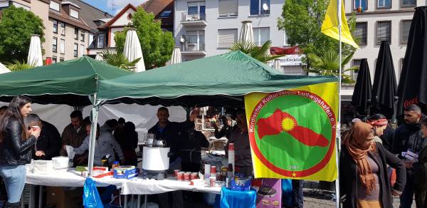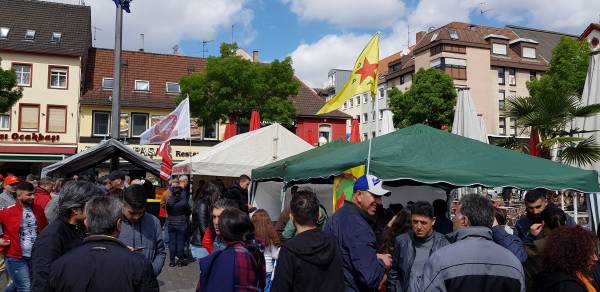 A rally took place in Mannheim, Germany, organized by trade unions, parties and other institutions. The Kurdish Community Center also rallied with its own colors. Information in German on the occupation of Afrin were handed out in Markplatz. In the square, parties and institutions set up food stands. The event ended with music.