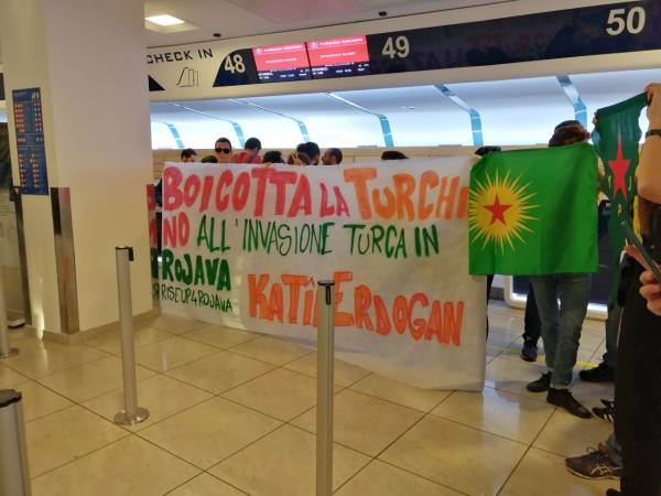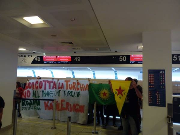 Besides dozens of rallies all over Italy, activists called attention to Turkish state fascism through various creative actions. Among other things like graffitis, spreading flyers and hanging posters, activists, i.e. in Naples, blocked the Check-In of Turkish Airlines. Under the slogan “Boycott Turkey, No to Turkish invasion in Rojava” activists successfully blocked a flight to Istanbul at the Capodichino Airport. On Saturday, the local group of Fridays For Future in Napoli disturbed an event of the Foreign ministry to call for a stop of military support for Turkey.
