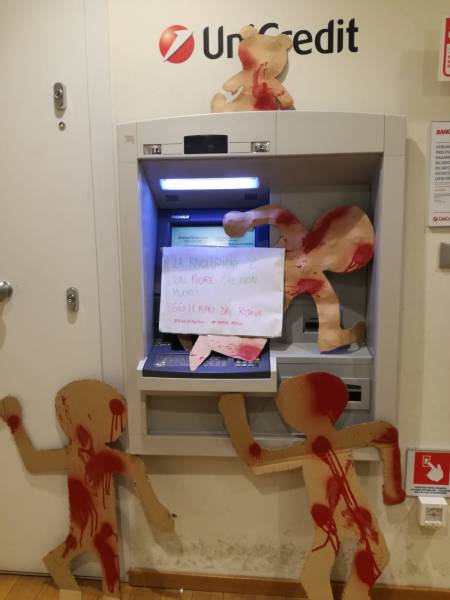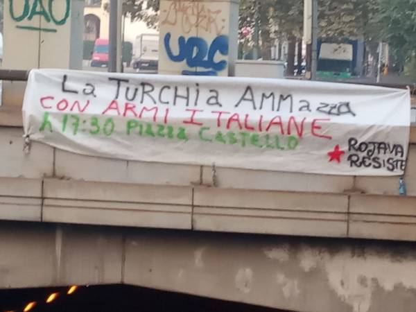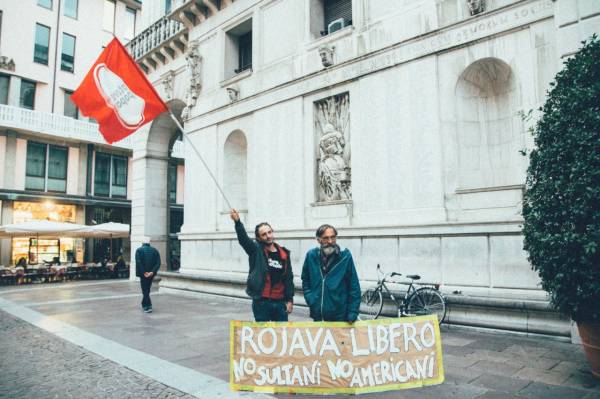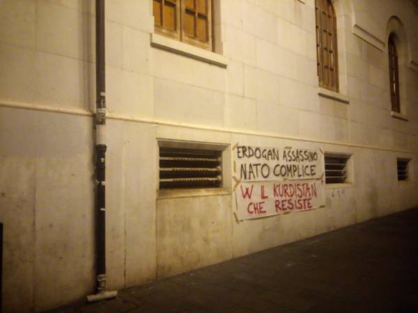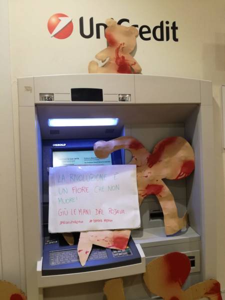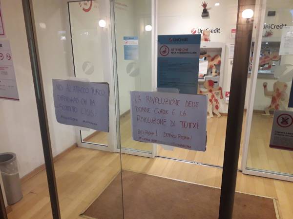 In many of the actions and rallies, activists drew attention the role of Italy in supporting the Turkish state, for example revealing the connections between banks and companies, e.g. Unicredit which owns Yapi Kredi, the most powerful public bank of Turkey, or the Leonardo S.p.A., an Italian armaments group which participated also in the so-called “Operation Olive Branch” which destroyed the Afrîn region of Rojava.