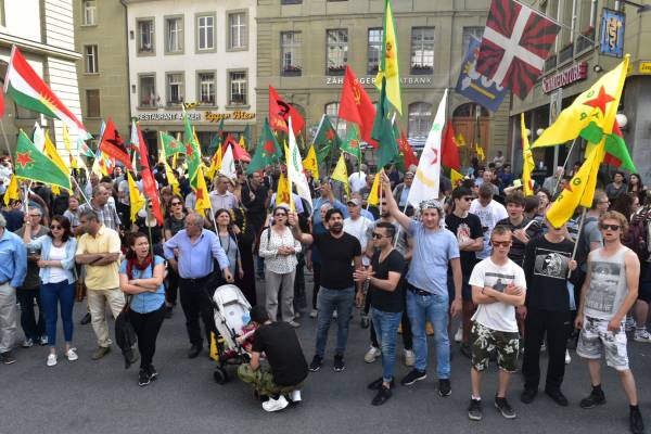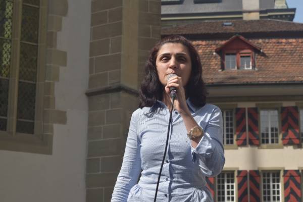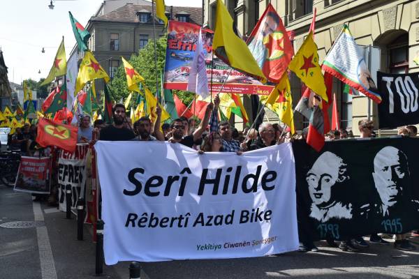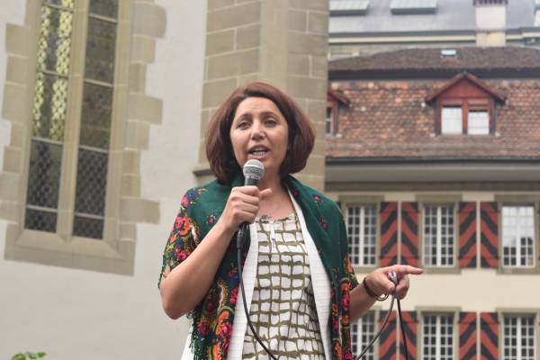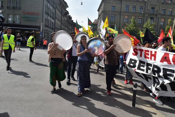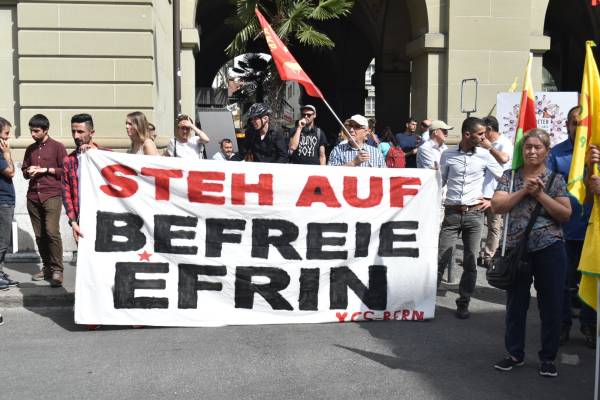 During the following rally, speeches were held on behalf of CDK-S, PYD, YCS, HDK, RJG (Swiss Pro-Alternative Youth) in German language, followed by speeches by Greens Party Bern Canton MP Haşim Sancar, Sur co-mayor Fatma Şık Barut, human rights activist Maya Hoffman and a representative for Afrin-Rojava Resistance Platform.