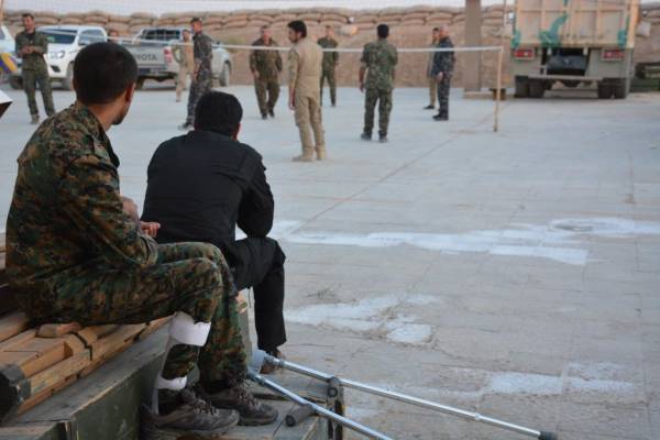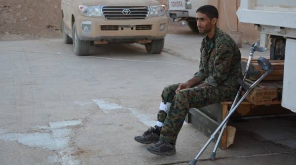 YPG fighter with crutches in the frontlines in Deir ez-Zor