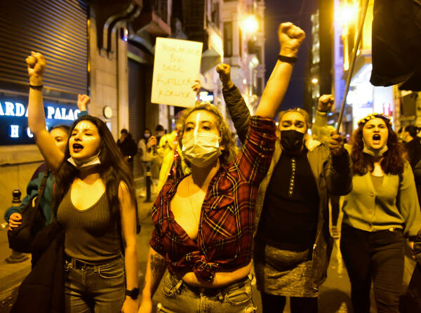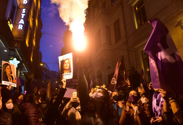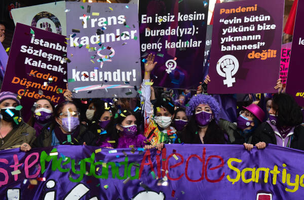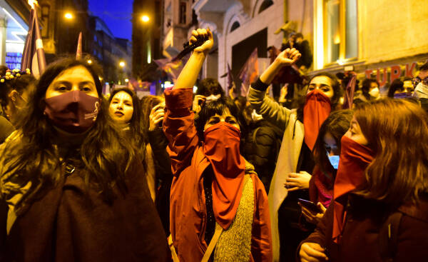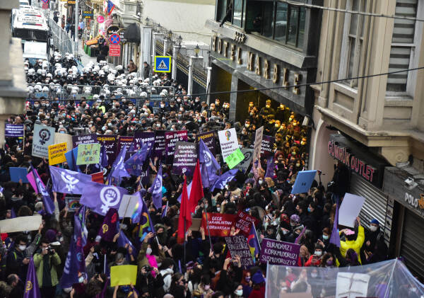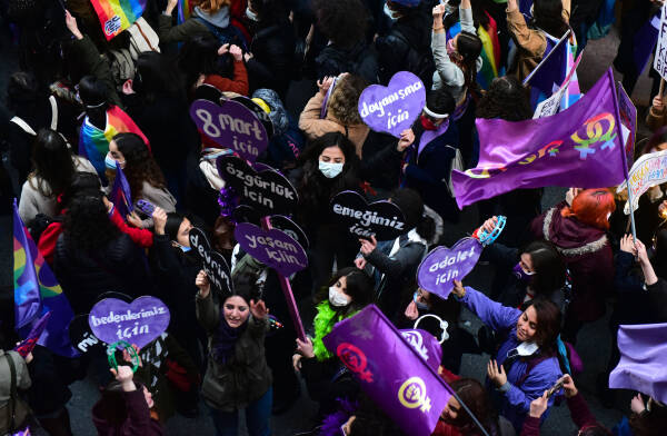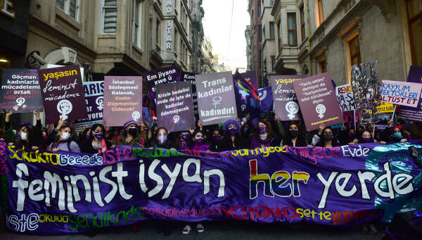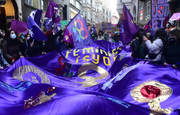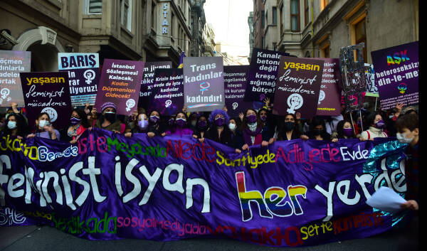 The feminist night march, which the Feminist Collective has been organizing since 2003 on the evening of March 8 to mark International Women's Day, has taken place in Istanbul. Under a sea of purple flags and their colorful dresses, signs and banners, thousands of women march from the cordoned-off Taksim Square towards Karaköy. Between loud concerts of whistles, the slogans "The nights, streets and squares belong to us", "The world would shake if women were free", "Women, life, freedom", "No male justice, but real justice" and "We are not silent, we are not afraid, we do not bend" resounded over and over again. The central motto of this year's march was "Feminist revolt instead of obedience - everywhere".