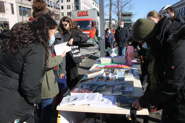Thousands of women celebrated March at Rotebülhplatz in Stuttgart where dozens of women’s organizations came together and staged a march to Schlossplatz. Meryem Women’s Initiative collected signatures for the “100 Reasons to Prosecute the Dictator” campaign.