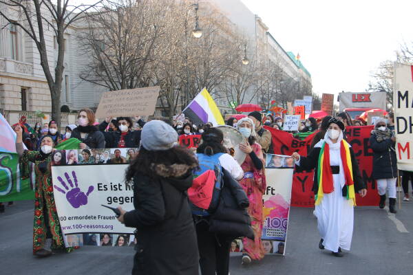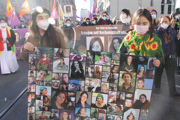 The March 8 Platform in Cologne, which is made up of dozens of women’s organizations, promoted rallies in 10 locations rather than a central rally because of the pandemic conditions. Kurdish women led by Viyan Women’s Council joined the rallies at Wienerplatz and Rudolfplatz.
