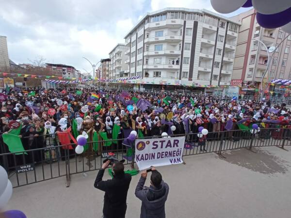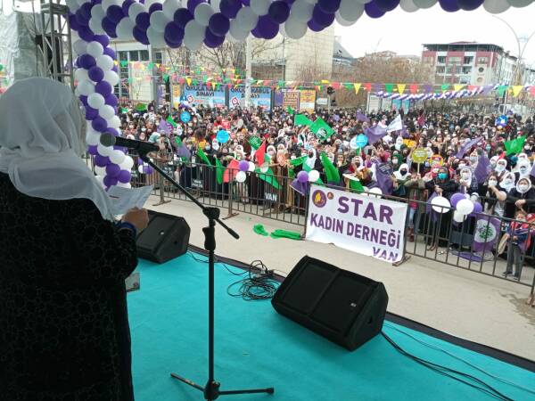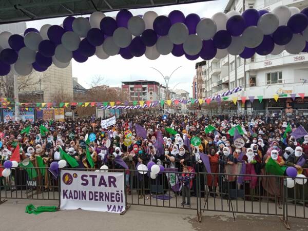 During a mass rally marking March 8 in Van, women protested Imrali isolation and said women's resistance would ensure a free life.