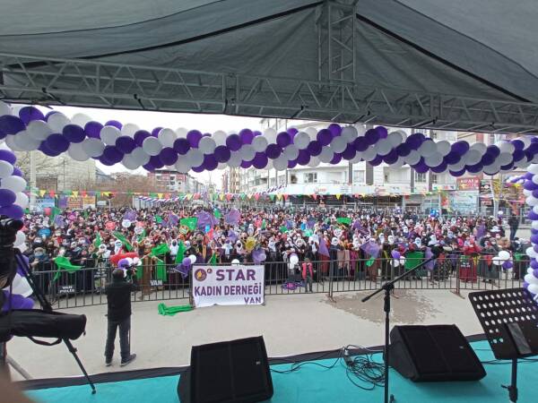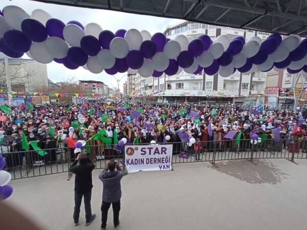 Free Women's Movement (TJA) and Peoples' Democratic Party (HDP) Women's Assembly held a regional rally under the motto "We promote life against femicide and freedom against isolation" in Van's İpekyolu district as part of the activities to mark March 8 International Women's Day. The Musa Anter Park where the rally was held was decorated with purple and white balloons. A banner that read "Our revolt is for our freedom!" was hung on the stage.