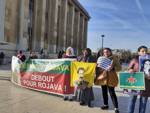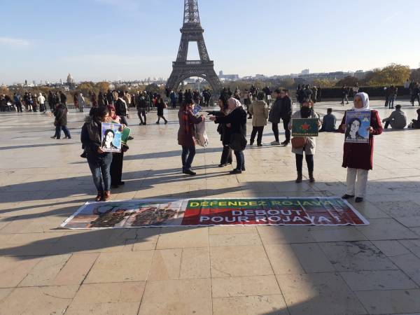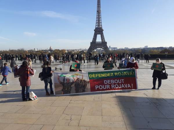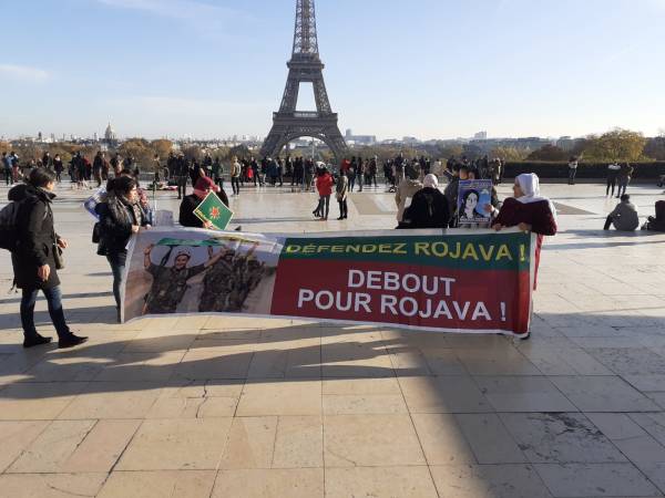 “Defend Rojava” read the banner unfurled by the members of the Paris Villiers Le Bel and Drancy Women’s Council in front of the Eiffel Tower. Displaying the photos of Kurdish female politician Havrin Khalaf who was murdered by Turkey’s mercenaries in October, and flags of the YPG/YPJ, the activists denounced violence against women and Turkish genocidal campaign seeking to invade North and East Syria.